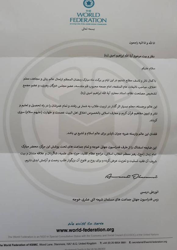 پیام تسلیت رئیس فدارسیون جهانی جماعت های مسلمان شیعه اثنی عشری خوجه در پی درگذشت حضرت آیت الله امینی ره پیام تسلیت رئیس فدارسیون جهانی جماعت های مسلمان شیعه اثنی عشری خوجه در پی درگذشت حضرت آیت الله امینی ره