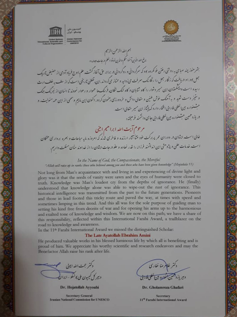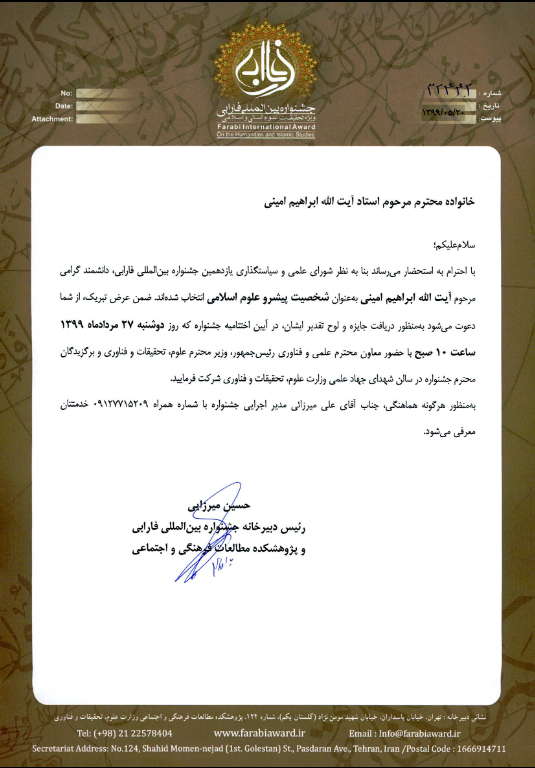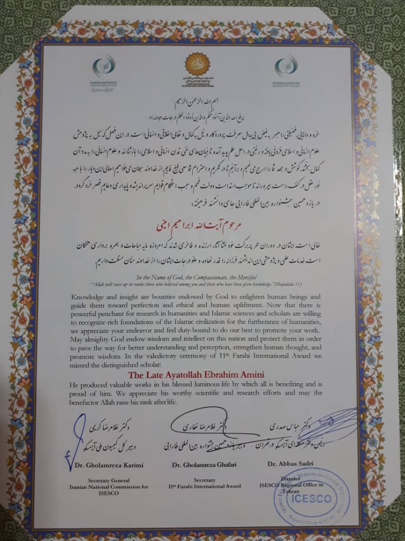 انتخاب آیت الله امینی(ره) به عنوان شخصیت پیشرو علوم اسلامی در جشنواره بین المللی فارابی انتخاب آیت الله امینی(ره) به عنوان شخصیت پیشرو علوم اسلامی در جشنواره بین المللی فارابی حضرت آیت الله ابراهیم امینی(ره) در بخش ویژه جشنواره فارابی به عنوان شخصیت پیشرو علوم انسانی و اسلامی معرفی شدند.